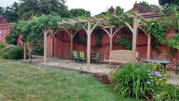 The photo above shows one we made and installed in Summer 2017. The site where we have positioned the bespoke pergola originally had a structure there, with a mature Wisteria clambering all over it. Our installation team dismantled the structure, carefully and tenderly untwining the wisteria. After construction of the new pergola, the Wisteria was gently coaxed onto its new home and we are happy to report is thriving. An oak swing seat large enough for four adults was hung to complete the design.