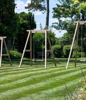 For smaller gardens, an oak pergola arch paired with a two-seater swing works beautifully as a room divider – it creates a zone within a zone. A single rope swing from an existing branch takes up no footprint at all. Larger gardens are where the three and four-seaters, the full pergolas and the swinging day beds come into their own.