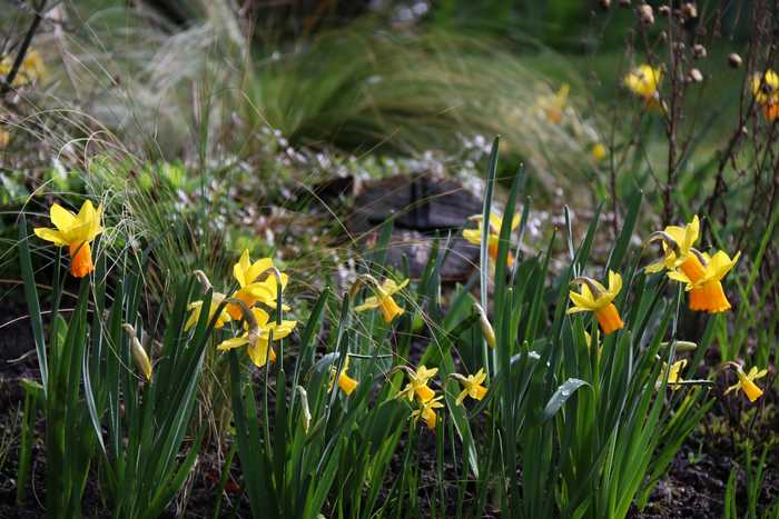 At the end of the summer last year, I reshaped and widened all the borders in the garden. To ensure that things didn’t look too bare in spring I planted lots of additional bulbs at the front of the borders and used the opportunity to try some different varieties of dwarf narcissi. The ones in the photo below are ‘Jetfire’ along with some of the original ‘Tête-à-Tête’ that had naturalised under the old tree (you can just see the old stump in the centre of the photo). I also planted ‘W P Milner’, ‘Topolino’, ‘Rip van Winkle’ and ‘Jack Snipe’ along with some white ‘Tête-à-Tête’.
