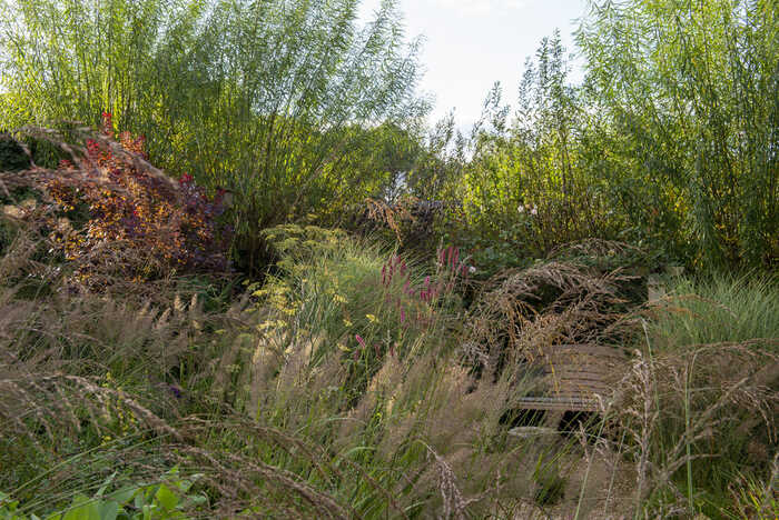 The garden is an immersive space of fresh foliage with ornamental grasses, masses of perennials and friendly giants such as the cardoons.