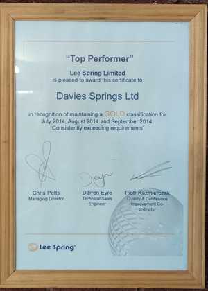 We are proud to have been awarded a certificate of excellence, for maintaining a gold classification for 3 consecutive months, from one of our global customers. Gold classification means being 100% correct on all aspects of supply. As you can imagine this is quite an achievement, so much so that to this day we are their only supplier to have been awarded this honour. One of our smaller customers even went to the trouble of making and sending us a wooden “Davies Springs” plaque to thank us for the way we looked after him.