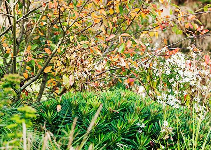 For a shady, dry spot beneath trees, Cyclamen hederifolium will hold delicate nodding flowers above a cluster of white, veined leaves. A real gem of a plant that will come back every year to delight you, just as you may be thinking the flowers in the garden are over. Planted alongside Arum italicum subsp. ‘Marmaratum’, or Lords and Ladies, and Helleborus niger, these woodland edge favourites create a tapestry of colour throughout the winter months and will gently colonise and make patches of delicious textures where little else thrives.