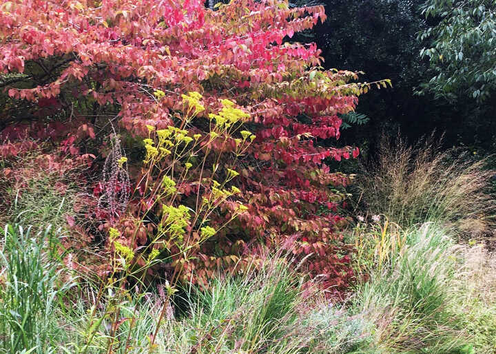 One of our favourite trees, the British native Acer campestre, or field maple, quickly changes its foliage from a fresh green to the most buttery of yellows which catches the low sun and holds it on the horizon. Often seen in countryside hedges, we love to plant this tree in gardens as it is easily kept to size and has the most incredible corky bark as it ages. Who can fail to love the bright scarlet leaves of another of our native hedgerow shrubs, Euonymous europeaus, with its waxy magenta berries and orange seeds dangling on bare stems. It’s a real firecracker of a small tree and will bring a brilliant flash of colour to cheer even the dullest days.