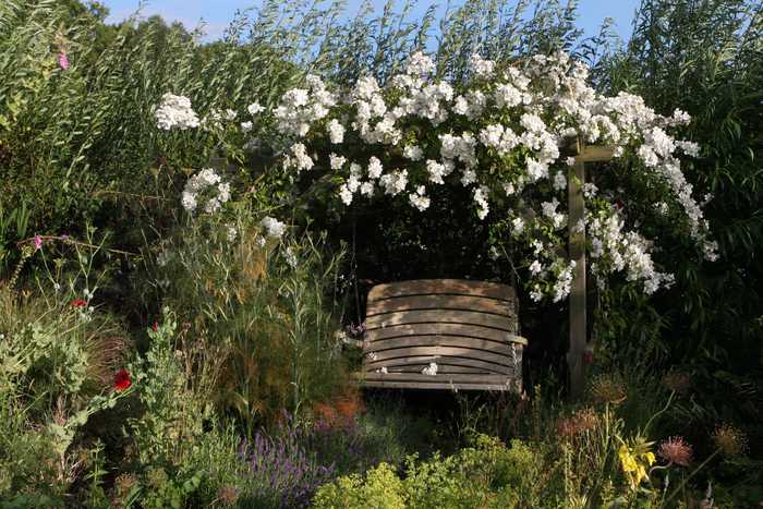 Wisteria, honeysuckle, and climbing roses are very effective in making your swing seat into a floral haven.