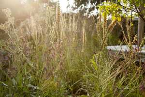 We always try and grab at least five minutes on this swing seat beneath the balcony. It’s a special spot as time seems to pause here and it’s important to sit and feel the garden and observe - not only it’s progress but, also the nature and wildlife that are inhabiting the space. The friendly robin always hops by in the branches of the willow and this year the new planting around the stone sculpture was alive with hover flies and bees, making the most of the tall Verbena macdougalii ‘Lavender Spires’.