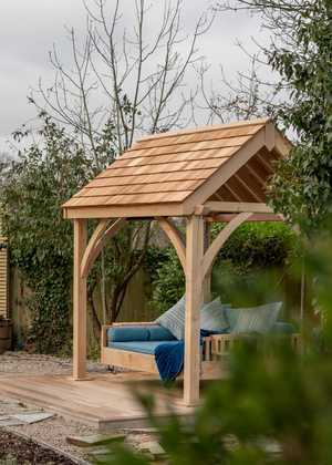 We are always excited to welcome a new product to our range and this one was no exception. Inspired by a wish from a customer (whose words we quote above), who loved our Swinging Day Bed & Pergola, but wanted the flexibility to use it in all weathers, we have created the absolute pinnacle of opulence and outdoor luxury: the swinging day bed with cedar shingle roof.
