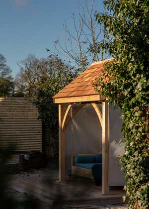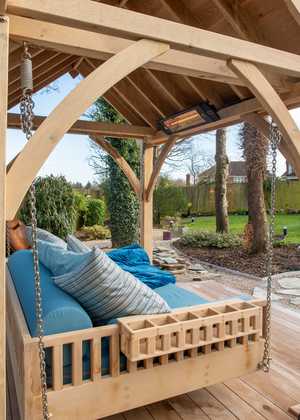 "We were on the hunt for more than a swing. We wanted to build a space that encouraged peace and relaxation and could be used all year round. The moment we arrived at the Sitting Spiritually garden and met Martin, we knew that the products on offer were different. Frankly, we were sold on the swing bed before a single word about it was uttered. Martin listened carefully to what we were looking for and committed to helping design a bespoke roof that would enhance the swing and give us the all year round usage we were after. The whole process of selecting fabrics and accessories was very efficient with the assurance of quality throughout. On the day of installation, we met Alex who had crafted the swinging bed, pergola & roof, and would install it on site. The craftsmanship and care taken was impressive. Now the swing bed is in place, it has delivered beyond our expectations. We installed electricity and infra-red heating and have used the swing most days, in all weathers. These people are lovely to work with and their swings offer something beyond the tangible .... maybe even spiritual. Martin, Alex & the team - thank you all so much". S. Thaker