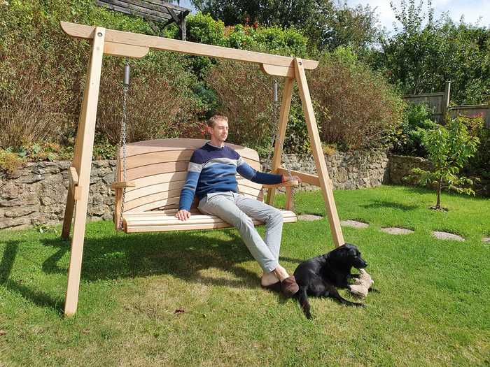 Above: Chris Robinson Enjoying the Rainbow Swing bench with their adorable dog.