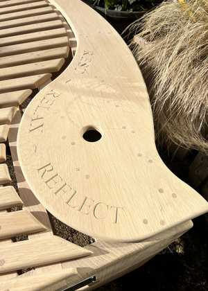 With a bit of to-ing and fro-ing we settled on a design and some wording for our wonderful new oak bench. I wanted to include some wording and chose: Rest, Relax, Reflect, which have been beautifully carved into the seat. Taking time out of the hustle and bustle of a busy ward, clinic or office is crucial to staff well-being and so many are on their feet all day – so taking a moment to sit and just begin to reflect felt important.