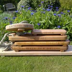 Our swings all come with synthetic hemp ropes and are spliced by hand for us by a local man who trained with the famous Bridport Gundry Rope Makers so they are kinder to your tree and will not rot. The ropes come ready with our no knots fixing kit to make hanging the swing extremely simple, all with marine grade stainless steel fittings which are suitable for their life outside.