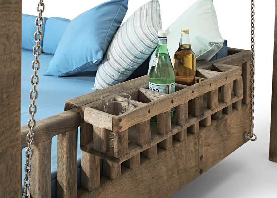 How do you make a swinging day bed—the absolute epitome of luxury and comfort—even more luxurious? Well, it’s something we’ve been pondering for a while, and we think we have come up with the solution. Glass holders.