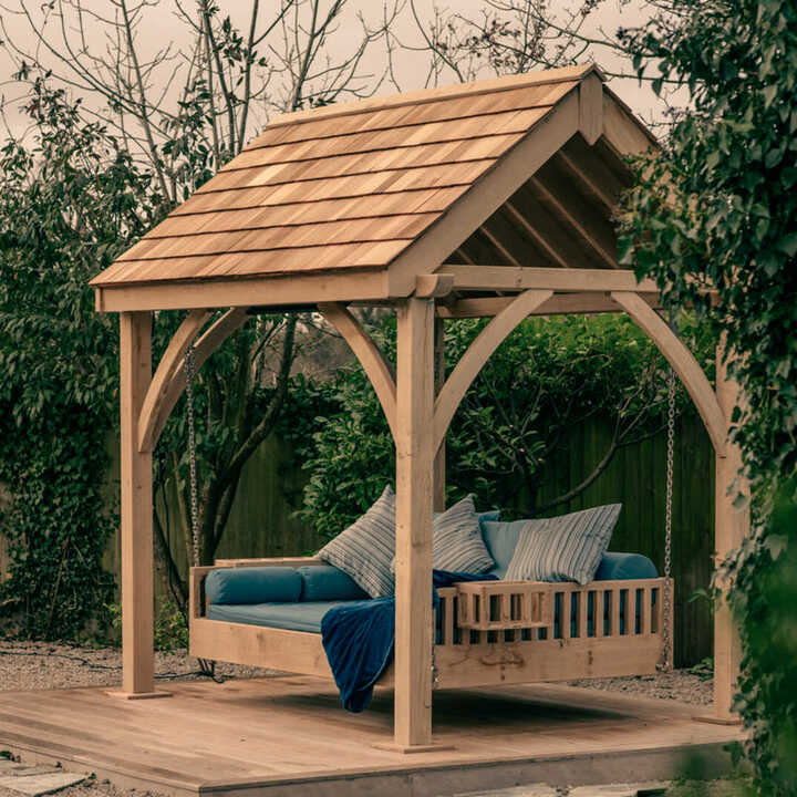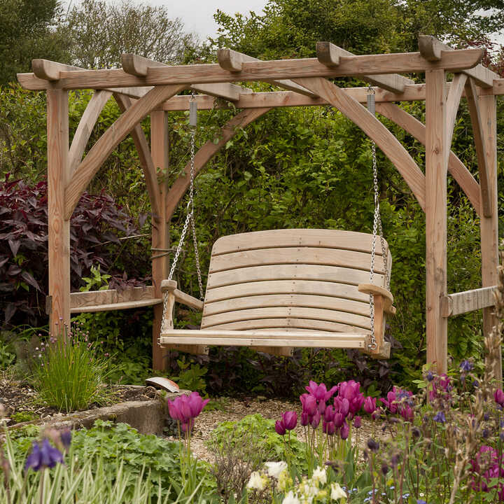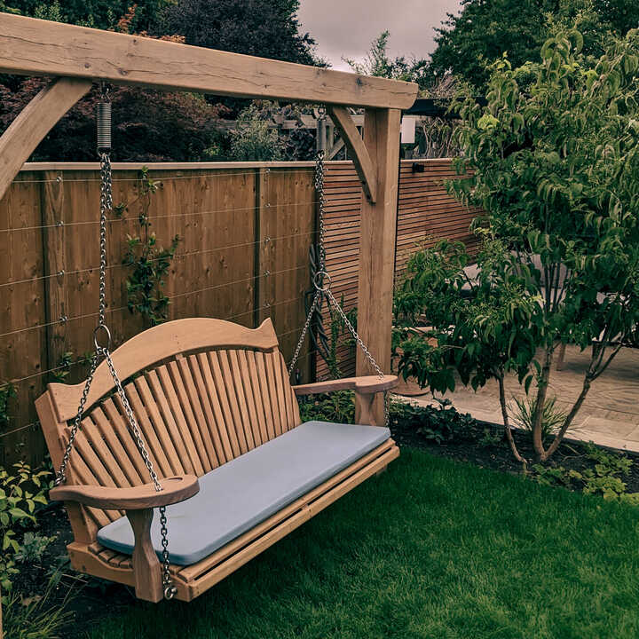 The RHS Serenity Garden Swing Seat is made using premium Western Red Cedar. Available with one of any five back designs and as one, two, three or four seater, it is a beautiful hand crafted piece of outdoor garden furniture. The incredibly durable nature of our wooden garden swing seat means it can be left outside all year round without any rotting. As with all of our garden furniture range, it can be hung from a tree bough, porch or existing pergola should you wish.